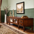 传统复古的实木电视柜,以做旧的工艺,展现出了传统朴实的韵味。而电视墙上设计的金色花卉装饰壁纸,使得简约传统的空间内弥漫着精致而沉稳的气质。客厅内的绿色植物点缀,使得中式客厅不显沉闷单调。